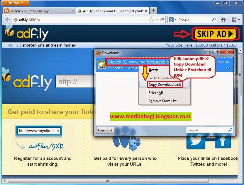 di sini saya akan memberikan tutorial download menggunakan link dari wuala download Bleach.3gp